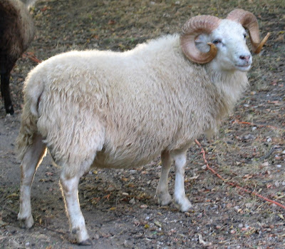 Wraith INGL RAM 01H 019W: Horned white twin ram. Born April 1, 2009. 5 lbs., 15 oz. at birth. Carries moorit, possibly black, and either solid or badger. May carry spotting. 37.5% AI bloodlines (Bambi, Blaevar, Kongur, Biskup). 25% Macbeth. This lamb should have an exceptional fleece. He's not as flashy as his twin, Whirligig, above, but he has the same genetics plus a slightly stouter build. Sire has superb fleece and exceptional heat/parasite resistance. Dam has a wide, meaty build; a long, soft fleece; and very good milkiness.